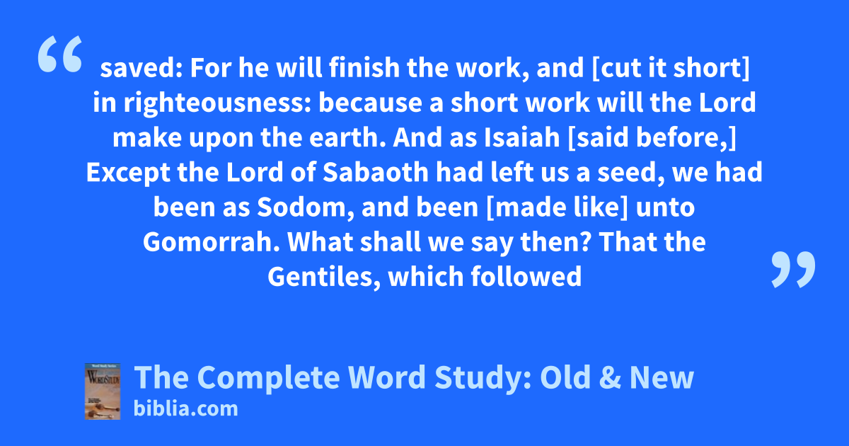 saved: For he will finish the work, and [cut it short] in righteousness: because a short work will the Lord make upon the earth. And as Isaiah [said before,] Except the Lord of Sabaoth had left us a seed, we had been as Sodom, and been [made like] unto Gomorrah. What shall we say then? That the Gentiles, which followed
