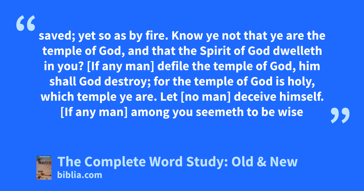 saved; yet so as by fire. Know ye not that ye are the temple of God, and that the Spirit of God dwelleth in you? [If any man] defile the temple of God, him shall God destroy; for the temple of God is holy, which temple ye are. Let [no man] deceive himself. [If any man] among you seemeth to be wise