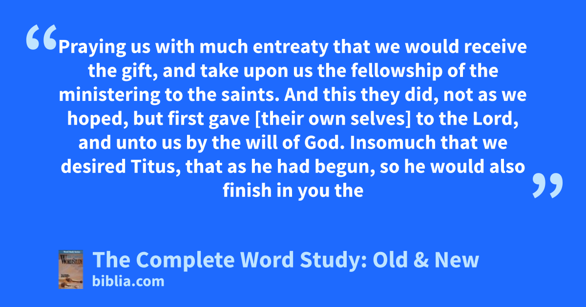 Praying us with much entreaty that we would receive the gift, and take upon us the fellowship of the ministering to the saints. And this they did, not as we hoped, but first gave [their own selves] to the Lord, and unto us by the will of God. Insomuch that we desired Titus, that as he had begun, so he would also finish in you the