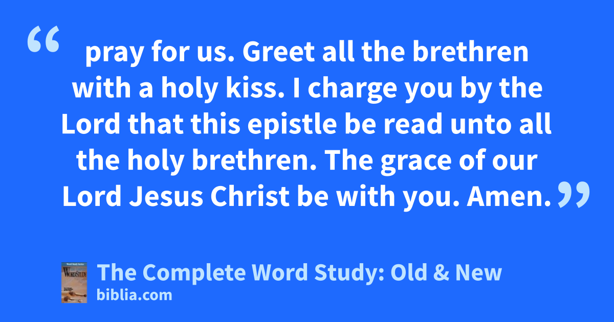 pray for us. Greet all the brethren with a holy kiss. I charge you by the Lord that this epistle be read unto all the holy brethren. The grace of our Lord Jesus Christ be with you. Amen.