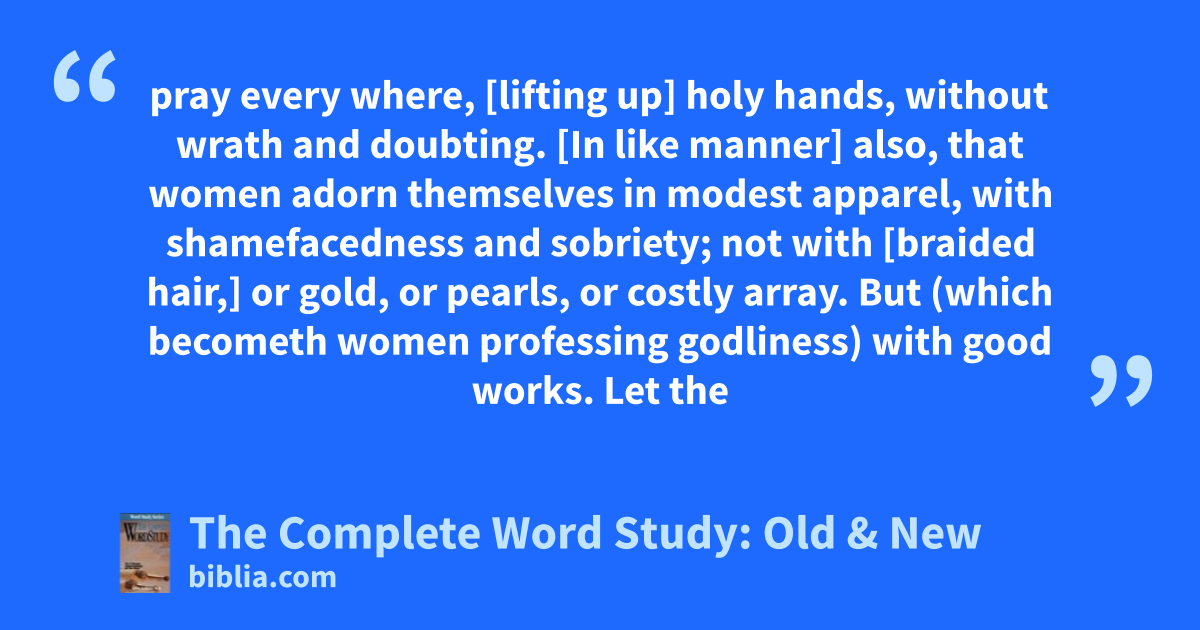 pray every where, [lifting up] holy hands, without wrath and doubting. [In like manner] also, that women adorn themselves in modest apparel, with shamefacedness and sobriety; not with [braided hair,] or gold, or pearls, or costly array. But (which becometh women professing godliness) with good works. Let the