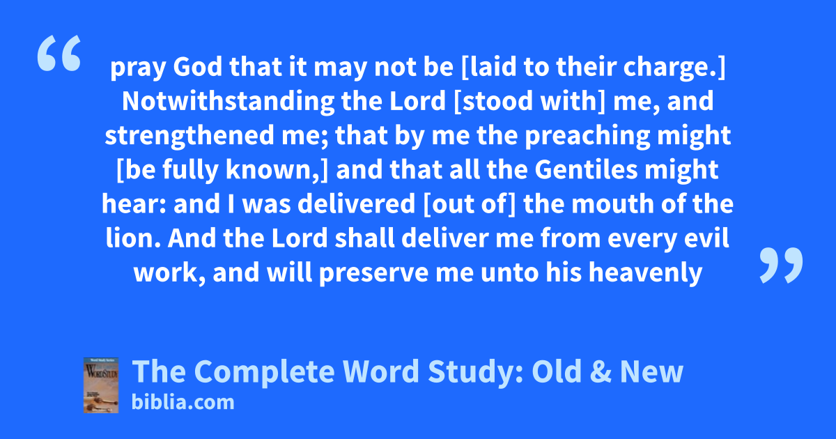 pray God that it may not be [laid to their charge.] Notwithstanding the Lord [stood with] me, and strengthened me; that by me the preaching might [be fully known,] and that all the Gentiles might hear: and I was delivered [out of] the mouth of the lion. And the Lord shall deliver me from every evil work, and will preserve me unto his heavenly