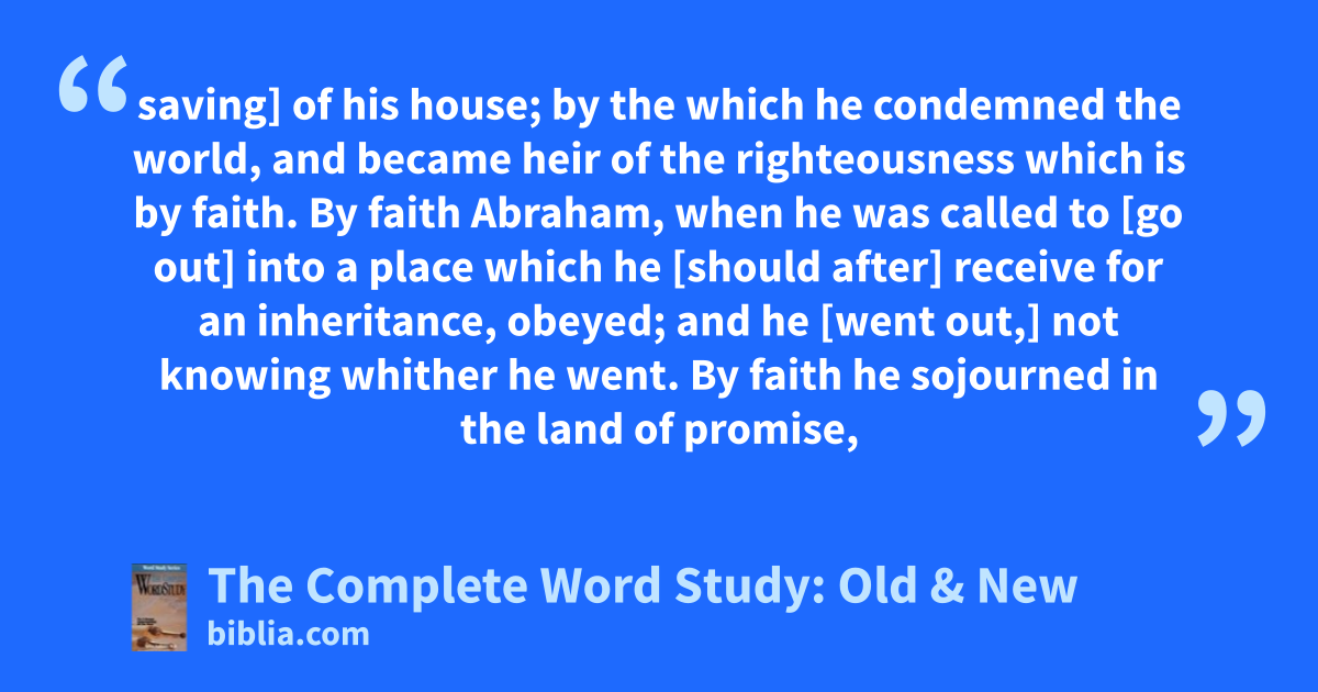 saving] of his house; by the which he condemned the world, and became heir of the righteousness which is by faith. By faith Abraham, when he was called to [go out] into a place which he [should after] receive for an inheritance, obeyed; and he [went out,] not knowing whither he went. By faith he sojourned in the land of promise,