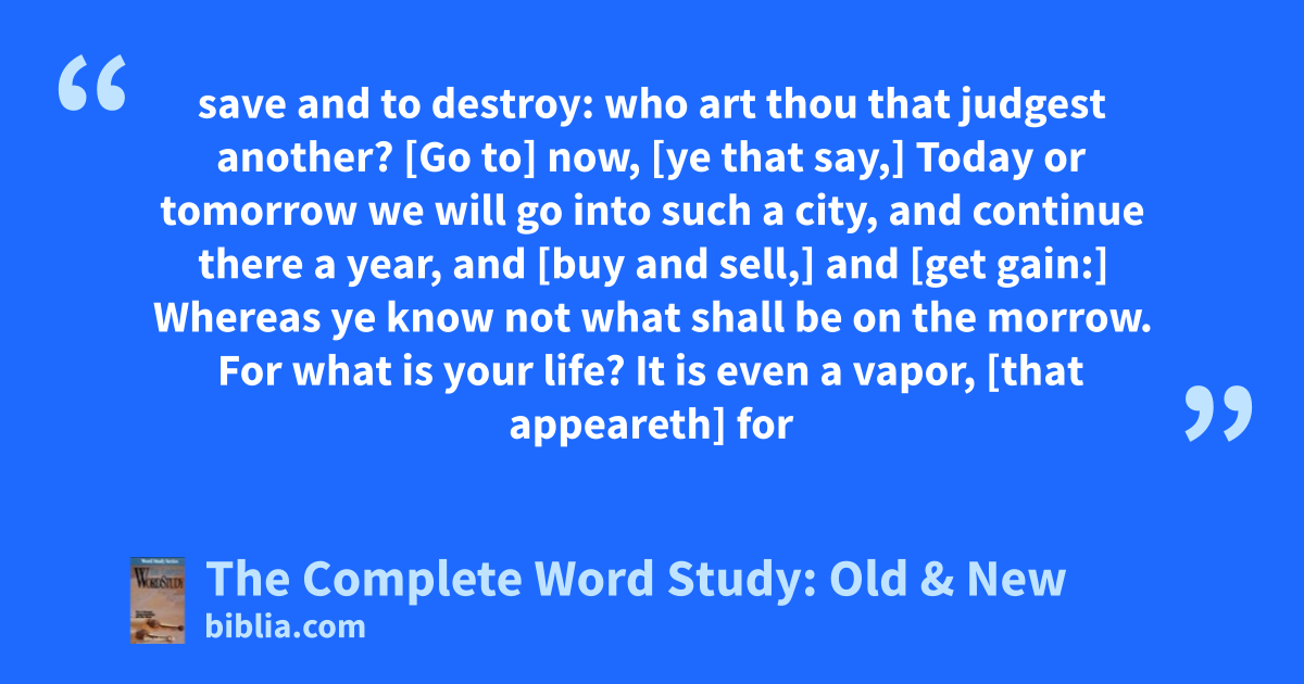 save and to destroy: who art thou that judgest another? [Go to] now, [ye that say,] Today or tomorrow we will go into such a city, and continue there a year, and [buy and sell,] and [get gain:] Whereas ye know not what shall be on the morrow. For what is your life? It is even a vapor, [that appeareth] for