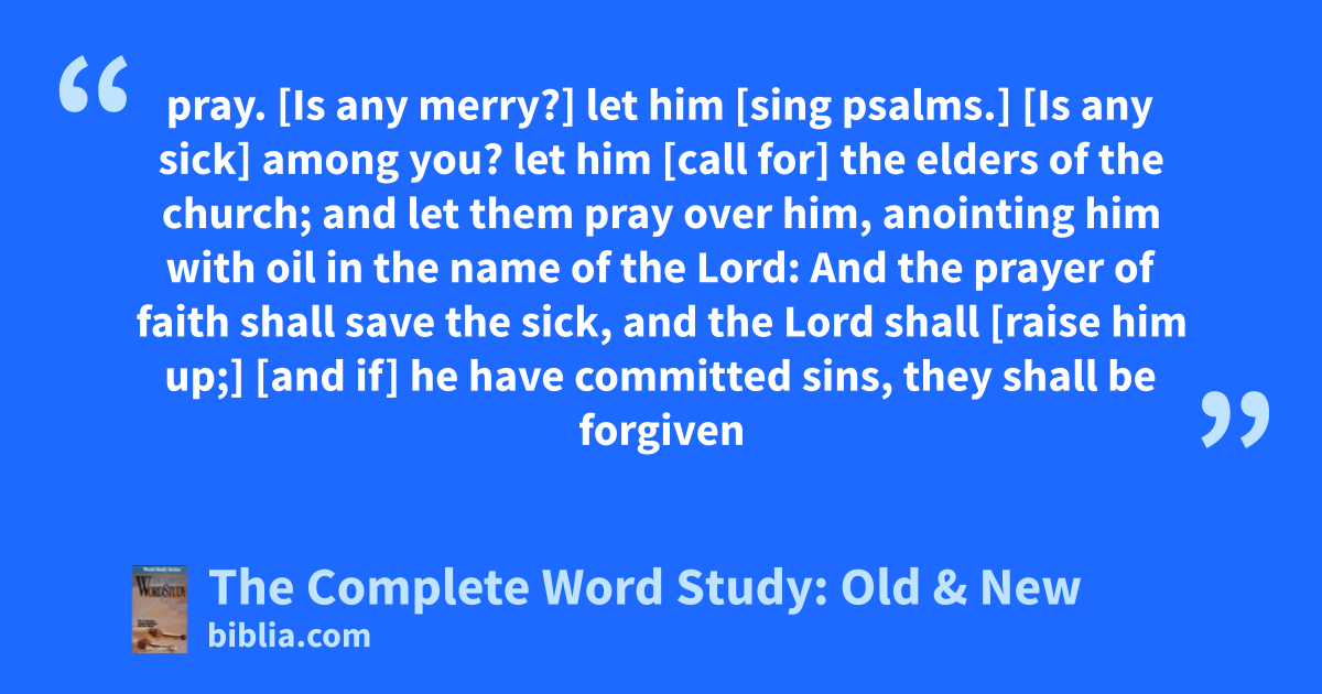 pray. [Is any merry?] let him [sing psalms.] [Is any sick] among you? let him [call for] the elders of the church; and let them pray over him, anointing him with oil in the name of the Lord: And the prayer of faith shall save the sick, and the Lord shall [raise him up;] [and if] he have committed sins, they shall be forgiven