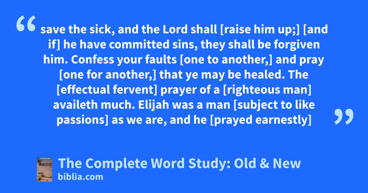 save the sick, and the Lord shall [raise him up;] [and if] he have committed sins, they shall be forgiven him. Confess your faults [one to another,] and pray [one for another,] that ye may be healed. The [effectual fervent] prayer of a [righteous man] availeth much. Elijah was a man [subject to like passions] as we are, and he [prayed earnestly]