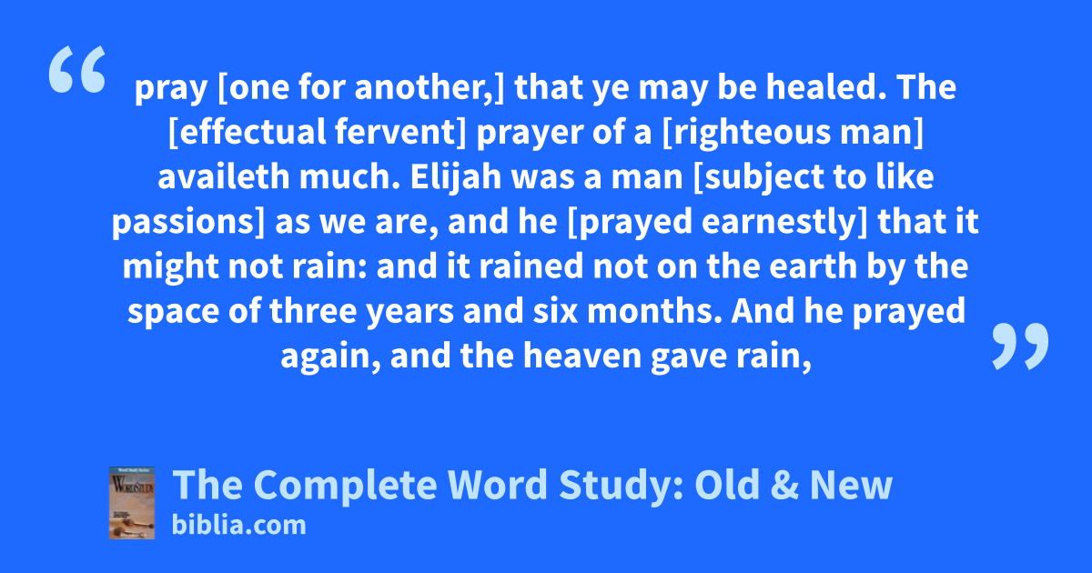 pray [one for another,] that ye may be healed. The [effectual fervent] prayer of a [righteous man] availeth much. Elijah was a man [subject to like passions] as we are, and he [prayed earnestly] that it might not rain: and it rained not on the earth by the space of three years and six months. And he prayed again, and the heaven gave rain,