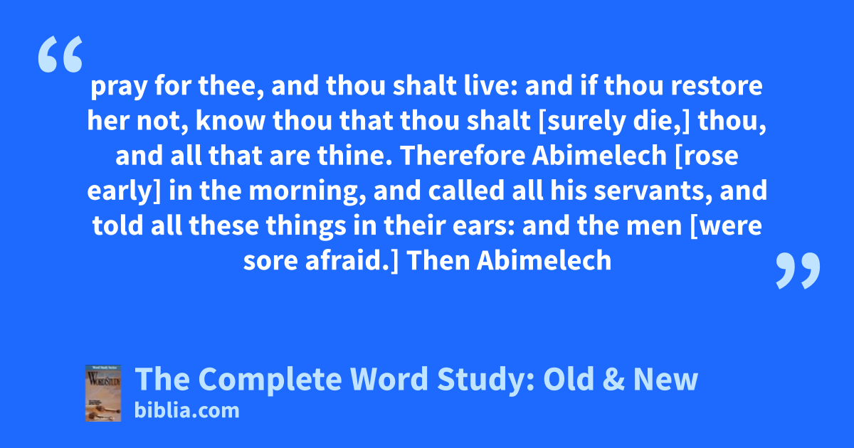 pray for thee, and thou shalt live: and if thou restore her not, know thou that thou shalt [surely die,] thou, and all that are thine. Therefore Abimelech [rose early] in the morning, and called all his servants, and told all these things in their ears: and the men [were sore afraid.] Then Abimelech