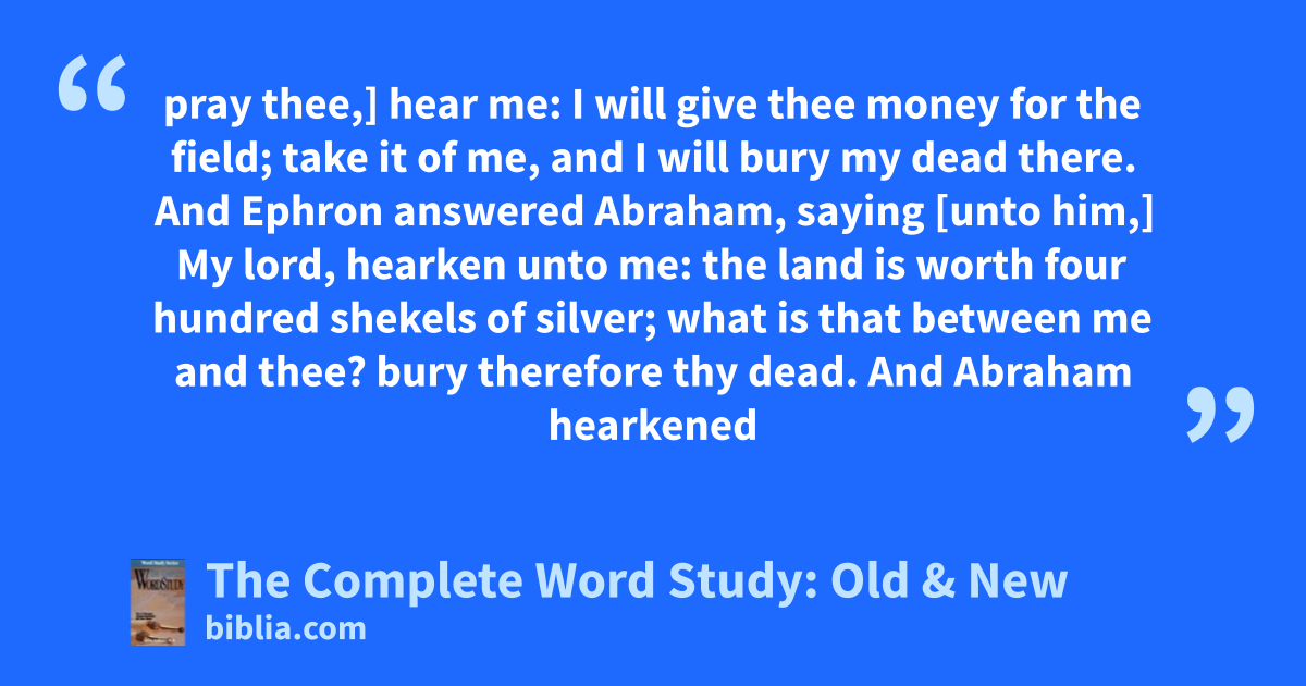 pray thee,] hear me: I will give thee money for the field; take it of me, and I will bury my dead there. And Ephron answered Abraham, saying [unto him,] My lord, hearken unto me: the land is worth four hundred shekels of silver; what is that between me and thee? bury therefore thy dead. And Abraham hearkened