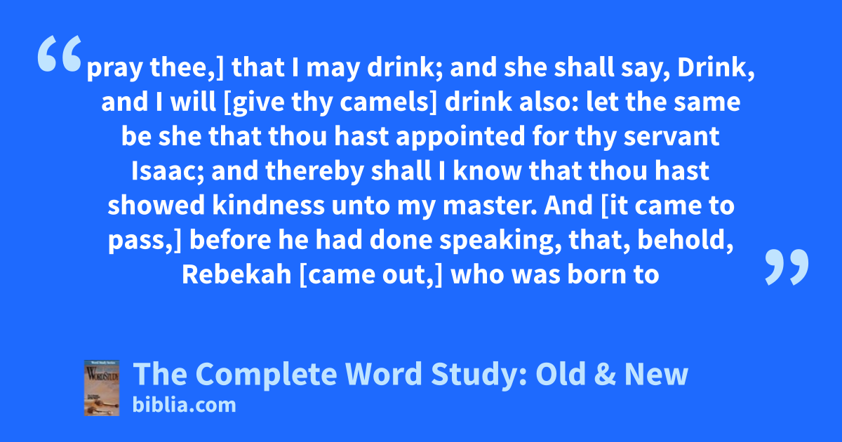 pray thee,] that I may drink; and she shall say, Drink, and I will [give thy camels] drink also: let the same be she that thou hast appointed for thy servant Isaac; and thereby shall I know that thou hast showed kindness unto my master. And [it came to pass,] before he had done speaking, that, behold, Rebekah [came out,] who was born to