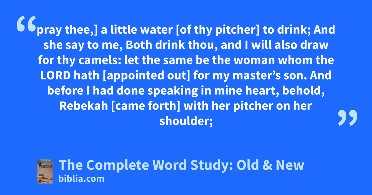 pray thee,] a little water [of thy pitcher] to drink; And she say to me, Both drink thou, and I will also draw for thy camels: let the same be the woman whom the LORD hath [appointed out] for my master’s son. And before I had done speaking in mine heart, behold, Rebekah [came forth] with her pitcher on her shoulder;