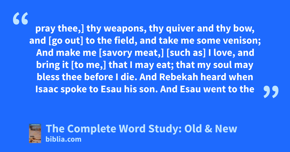 pray thee,] thy weapons, thy quiver and thy bow, and [go out] to the field, and take me some venison; And make me [savory meat,] [such as] I love, and bring it [to me,] that I may eat; that my soul may bless thee before I die. And Rebekah heard when Isaac spoke to Esau his son. And Esau went to the