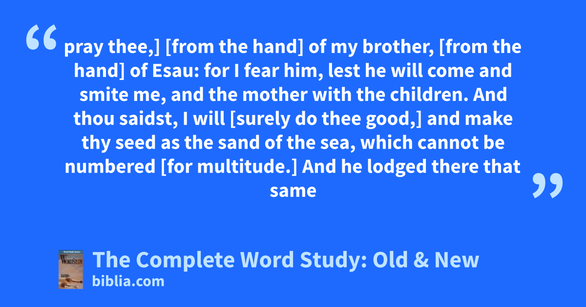 pray thee,] [from the hand] of my brother, [from the hand] of Esau: for I fear him, lest he will come and smite me, and the mother with the children. And thou saidst, I will [surely do thee good,] and make thy seed as the sand of the sea, which cannot be numbered [for multitude.] And he lodged there that same
