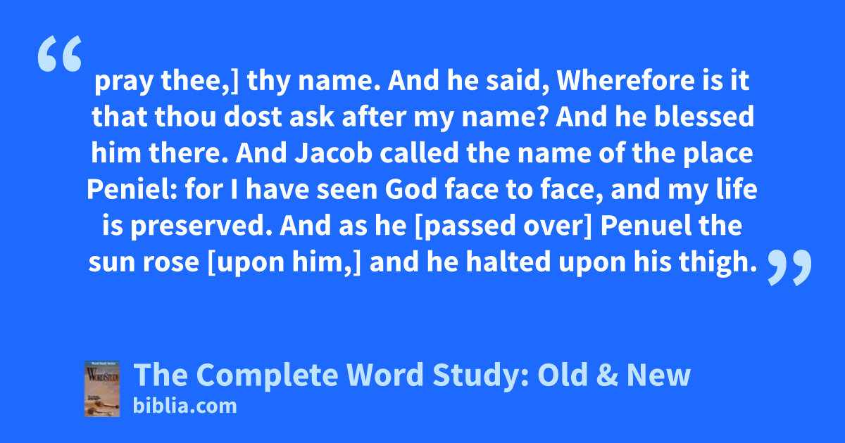 pray thee,] thy name. And he said, Wherefore is it that thou dost ask after my name? And he blessed him there. And Jacob called the name of the place Peniel: for I have seen God face to face, and my life is preserved. And as he [passed over] Penuel the sun rose [upon him,] and he halted upon his thigh.