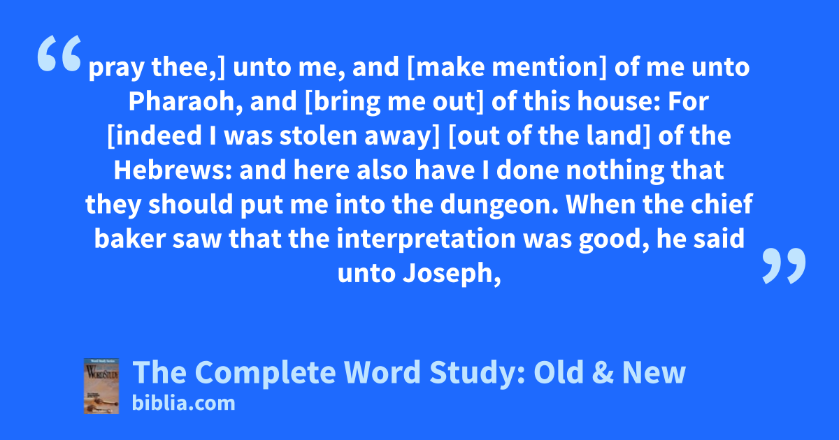 pray thee,] unto me, and [make mention] of me unto Pharaoh, and [bring me out] of this house: For [indeed I was stolen away] [out of the land] of the Hebrews: and here also have I done nothing that they should put me into the dungeon. When the chief baker saw that the interpretation was good, he said unto Joseph,