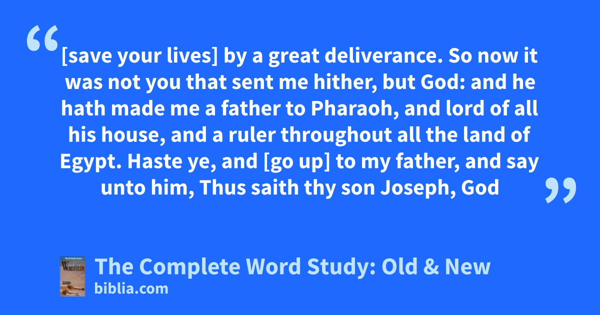 [save your lives] by a great deliverance. So now it was not you that sent me hither, but God: and he hath made me a father to Pharaoh, and lord of all his house, and a ruler throughout all the land of Egypt. Haste ye, and [go up] to my father, and say unto him, Thus saith thy son Joseph, God