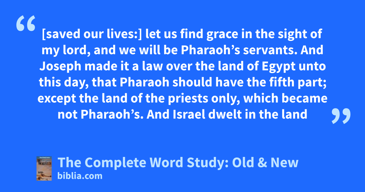 [saved our lives:] let us find grace in the sight of my lord, and we will be Pharaoh’s servants. And Joseph made it a law over the land of Egypt unto this day, that Pharaoh should have the fifth part; except the land of the priests only, which became not Pharaoh’s. And Israel dwelt in the land