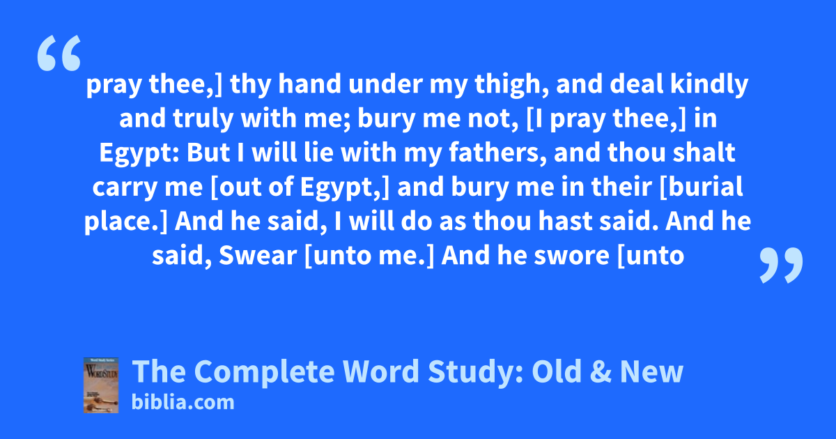 pray thee,] thy hand under my thigh, and deal kindly and truly with me; bury me not, [I pray thee,] in Egypt: But I will lie with my fathers, and thou shalt carry me [out of Egypt,] and bury me in their [burial place.] And he said, I will do as thou hast said. And he said, Swear [unto me.] And he swore [unto
