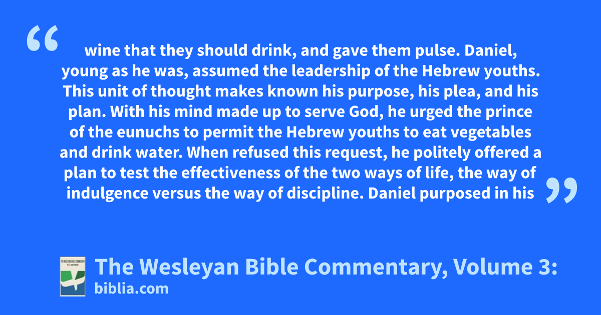 wine that they should drink, and gave them pulse. Daniel, young as he was, assumed the leadership of the Hebrew youths. This unit of thought makes known his purpose, his plea, and his plan. With his mind made up to serve God, he urged the prince of the eunuchs to permit the Hebrew youths to eat vegetables and drink water. When refused this request, he politely offered a plan to test the effectiveness of the two ways of life, the way of indulgence versus the way of discipline. Daniel purposed in his