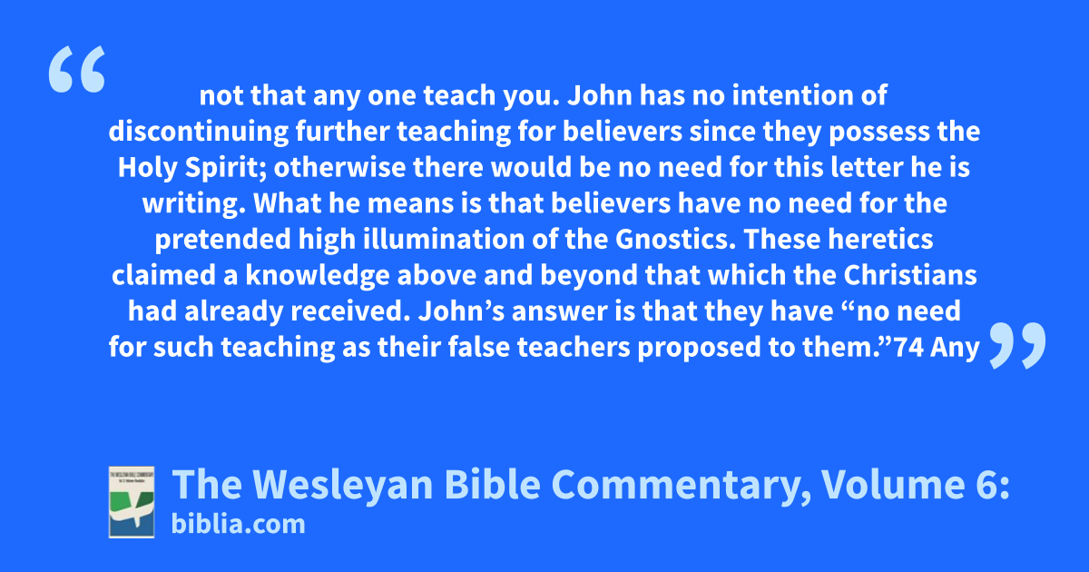 not that any one teach you. John has no intention of discontinuing further teaching for believers since they possess the Holy Spirit; otherwise there would be no need for this letter he is writing. What he means is that believers have no need for the pretended high illumination of the Gnostics. These heretics claimed a knowledge above and beyond that which the Christians had already received. John’s answer is that they have “no need for such teaching as their false teachers proposed to them.”74 Any