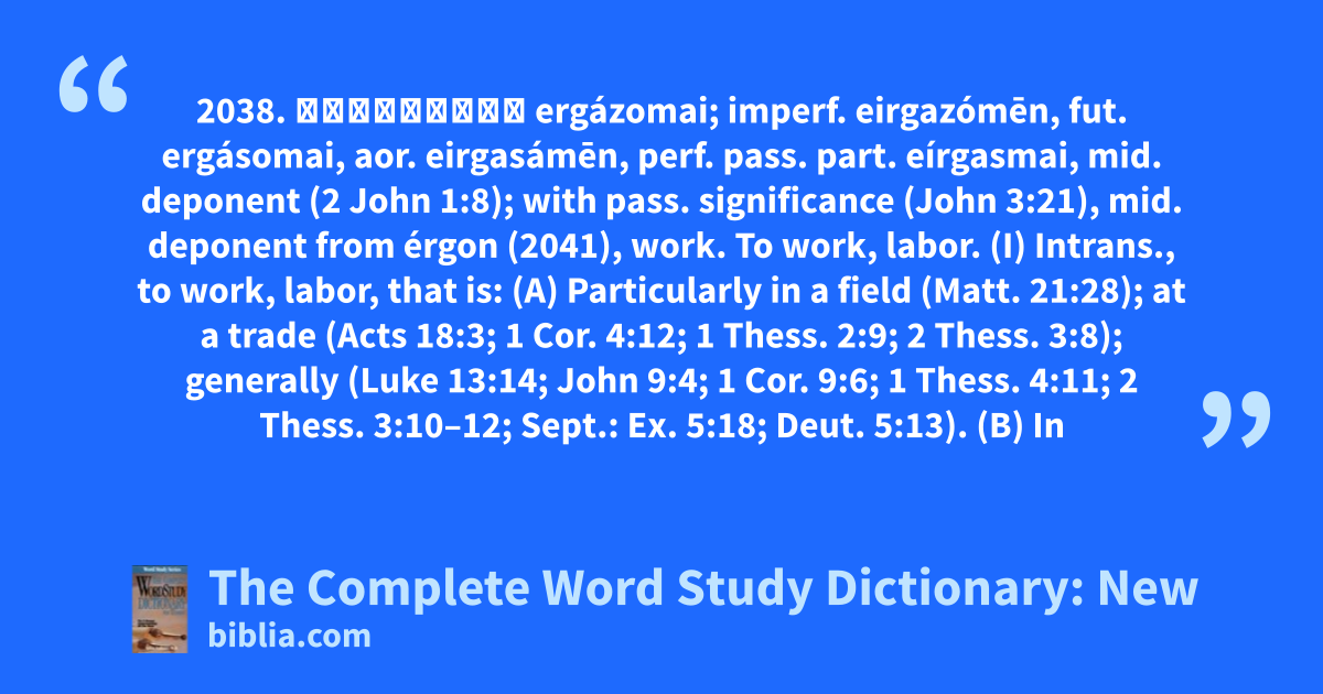 2038. ἐργάζομαι ergázomai; imperf. eirgazómēn, fut. ergásomai, aor. eirgasámēn, perf. pass. part. eírgasmai, mid. deponent (2 John 1:8); with pass. significance (John 3:21), mid. deponent from érgon (2041), work. To work, labor. (I) Intrans., to work, labor, that is: (A) Particularly in a field (Matt. 21:28); at a trade (Acts 18:3; 1 Cor. 4:12; 1 Thess. 2:9; 2 Thess. 3:8); generally (Luke 13:14; John 9:4; 1 Cor. 9:6; 1 Thess. 4:11; 2 Thess. 3:10–12; Sept.: Ex. 5:18; Deut. 5:13). (B) In