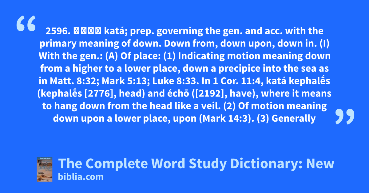 2596. κατά katá; prep. governing the gen. and acc. with the primary meaning of down. Down from, down upon, down in. (I) With the gen.: (A) Of place: (1) Indicating motion meaning down from a higher to a lower place, down a precipice into the sea as in Matt. 8:32; Mark 5:13; Luke 8:33. In 1 Cor. 11:4, katá kephalḗs (kephalḗs [2776], head) and échō ([2192], have), where it means to hang down from the head like a veil. (2) Of motion meaning down upon a lower place, upon (Mark 14:3). (3) Generally