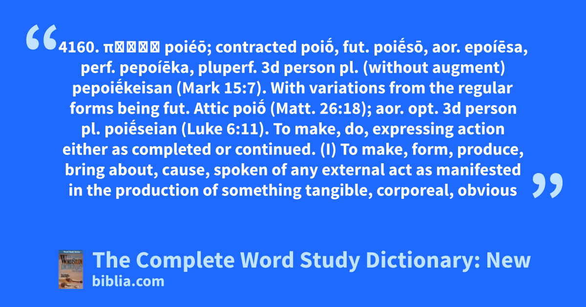 4160. ποιέω poiéō; contracted poiṓ, fut. poiḗsō, aor. epoíēsa, perf. pepoíēka, pluperf. 3d person pl. (without augment) pepoiḗkeisan (Mark 15:7). With variations from the regular forms being fut. Attic poiṓ (Matt. 26:18); aor. opt. 3d person pl. poiḗseian (Luke 6:11). To make, do, expressing action either as completed or continued. (I) To make, form, produce, bring about, cause, spoken of any external act as manifested in the production of something tangible, corporeal, obvious