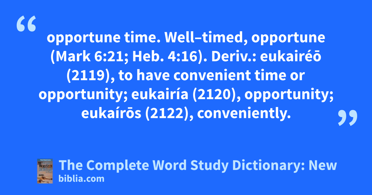 opportune time. Well–timed, opportune (Mark 6:21; Heb. 4:16). Deriv.: eukairéō (2119), to have convenient time or opportunity; eukairía (2120), opportunity; eukaírōs (2122), conveniently.