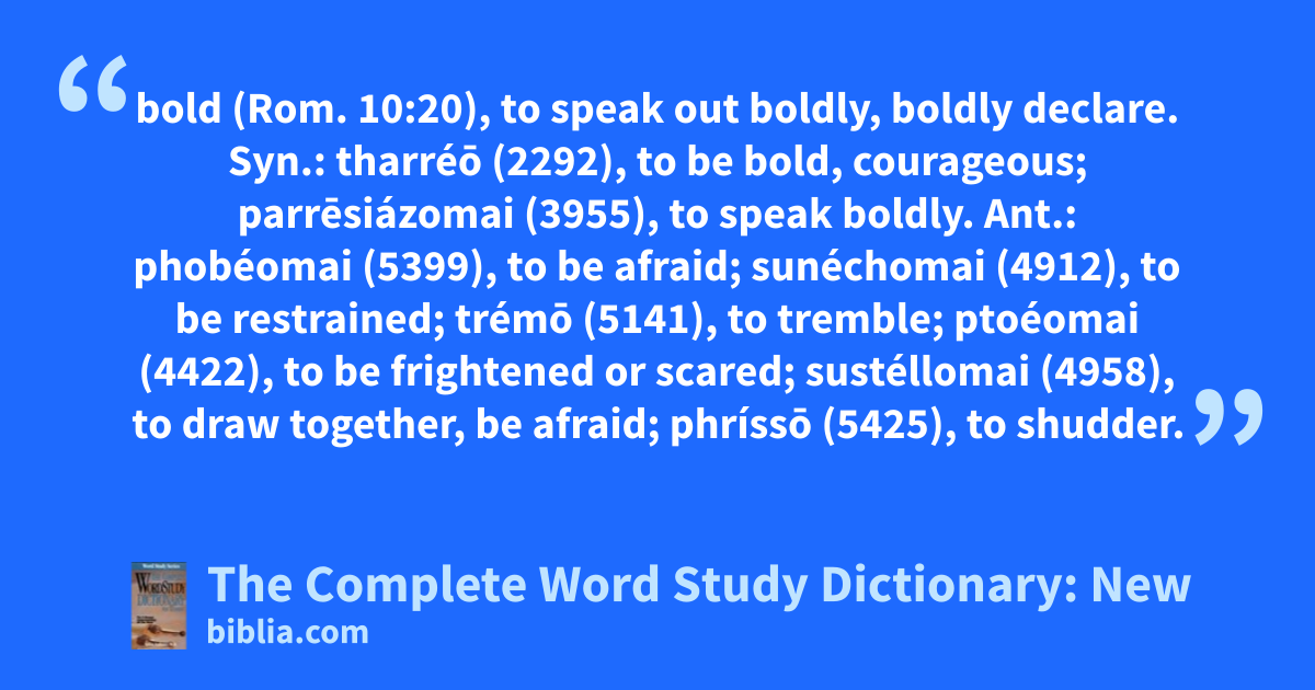 bold (Rom. 10:20), to speak out boldly, boldly declare. Syn.: tharréō (2292), to be bold, courageous; parrēsiázomai (3955), to speak boldly. Ant.: phobéomai (5399), to be afraid; sunéchomai (4912), to be restrained; trémō (5141), to tremble; ptoéomai (4422), to be frightened or scared; sustéllomai (4958), to draw together, be afraid; phríssō (5425), to shudder.