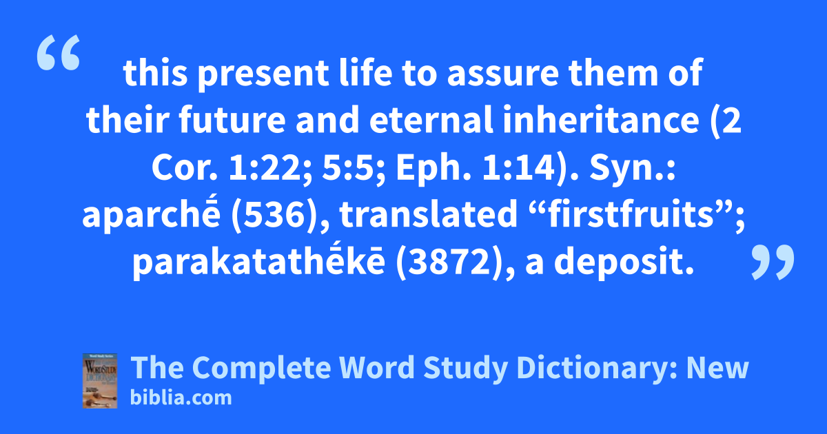 this present life to assure them of their future and eternal inheritance (2 Cor. 1:22; 5:5; Eph. 1:14). Syn.: aparchḗ (536), translated “firstfruits”; parakatathḗkē (3872), a deposit.