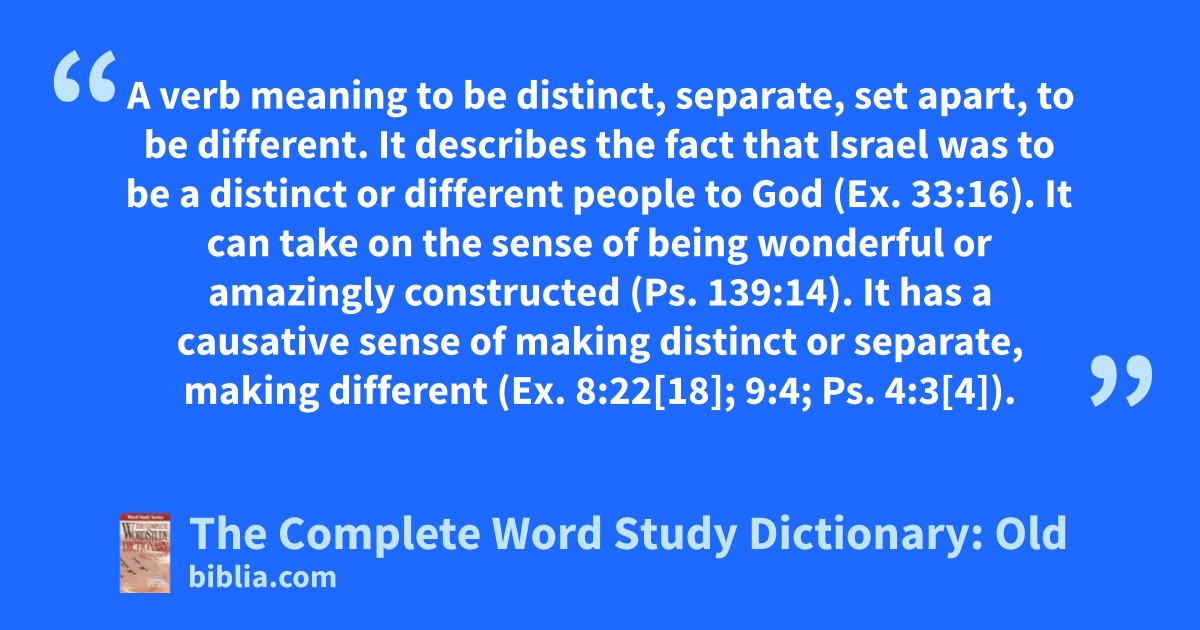 A verb meaning to be distinct, separate, set apart, to be different. It describes the fact that Israel was to be a distinct or different people to God (Ex. 33:16). It can take on the sense of being wonderful or amazingly constructed (Ps. 139:14). It has a causative sense of making distinct or separate, making different (Ex. 8:22[18]; 9:4; Ps. 4:3[4]).