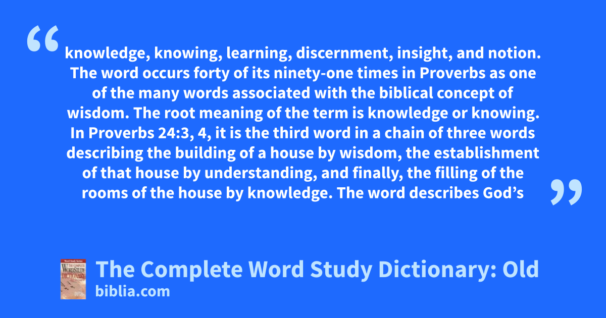 knowledge, knowing, learning, discernment, insight, and notion. The word occurs forty of its ninety-one times in Proverbs as one of the many words associated with the biblical concept of wisdom. The root meaning of the term is knowledge or knowing. In Proverbs 24:3, 4, it is the third word in a chain of three words describing the building of a house by wisdom, the establishment of that house by understanding, and finally, the filling of the rooms of the house by knowledge. The word describes God’s