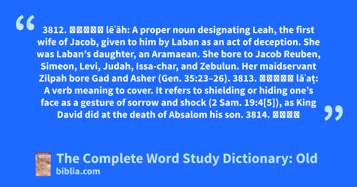 3812. לֵאָה lēʾāh: A proper noun designating Leah, the first wife of Jacob, given to him by Laban as an act of deception. She was Laban’s daughter, an Aramaean. She bore to Jacob Reuben, Simeon, Levi, Judah, Issa-char, and Zebulun. Her maidservant Zilpah bore Gad and Asher (Gen. 35:23–26). 3813. לָאַט lāʾaṭ: A verb meaning to cover. It refers to shielding or hiding one’s face as a gesture of sorrow and shock (2 Sam. 19:4[5]), as King David did at the death of Absalom his son. 3814. לָאט