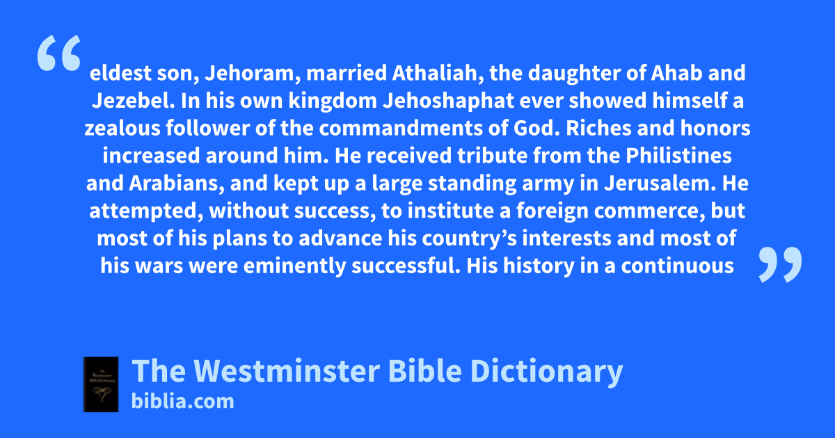 eldest son, Jehoram, married Athaliah, the daughter of Ahab and Jezebel. In his own kingdom Jehoshaphat ever showed himself a zealous follower of the commandments of God. Riches and honors increased around him. He received tribute from the Philistines and Arabians, and kept up a large standing army in Jerusalem. He attempted, without success, to institute a foreign commerce, but most of his plans to advance his country’s interests and most of his wars were eminently successful. His history in a continuous