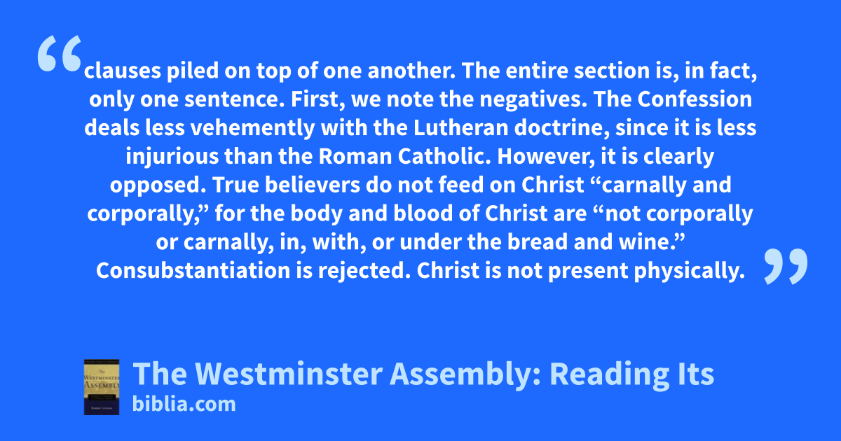 clauses piled on top of one another. The entire section is, in fact, only one sentence. First, we note the negatives. The Confession deals less vehemently with the Lutheran doctrine, since it is less injurious than the Roman Catholic. However, it is clearly opposed. True believers do not feed on Christ “carnally and corporally,” for the body and blood of Christ are “not corporally or carnally, in, with, or under the bread and wine.” Consubstantiation is rejected. Christ is not present physically.