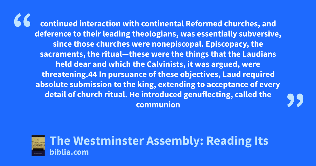 continued interaction with continental Reformed churches, and deference to their leading theologians, was essentially subversive, since those churches were nonepiscopal. Episcopacy, the sacraments, the ritual—these were the things that the Laudians held dear and which the Calvinists, it was argued, were threatening.44 In pursuance of these objectives, Laud required absolute submission to the king, extending to acceptance of every detail of church ritual. He introduced genuflecting, called the communion