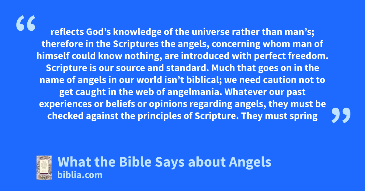 reflects God’s knowledge of the universe rather than man’s; therefore in the Scriptures the angels, concerning whom man of himself could know nothing, are introduced with perfect freedom. Scripture is our source and standard. Much that goes on in the name of angels in our world isn’t biblical; we need caution not to get caught in the web of angelmania. Whatever our past experiences or beliefs or opinions regarding angels, they must be checked against the principles of Scripture. They must spring