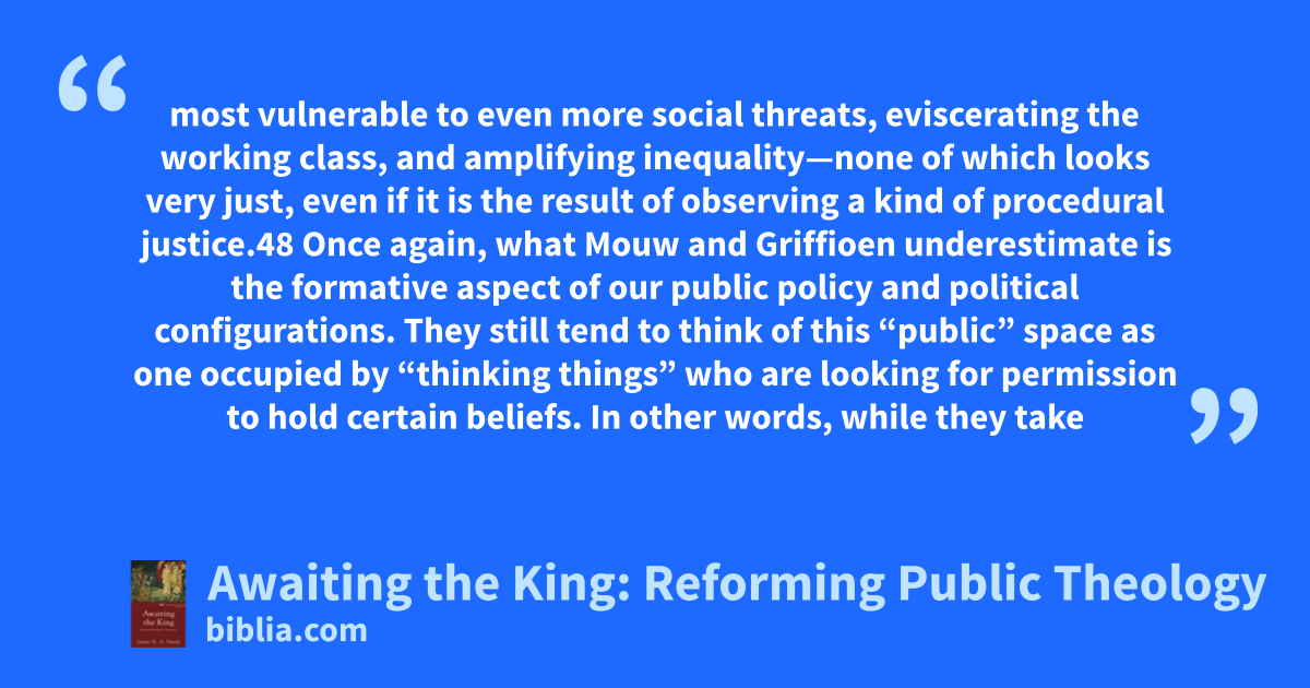 most vulnerable to even more social threats, eviscerating the working class, and amplifying inequality—none of which looks very just, even if it is the result of observing a kind of procedural justice.48 Once again, what Mouw and Griffioen underestimate is the formative aspect of our public policy and political configurations. They still tend to think of this “public” space as one occupied by “thinking things” who are looking for permission to hold certain beliefs. In other words, while they take