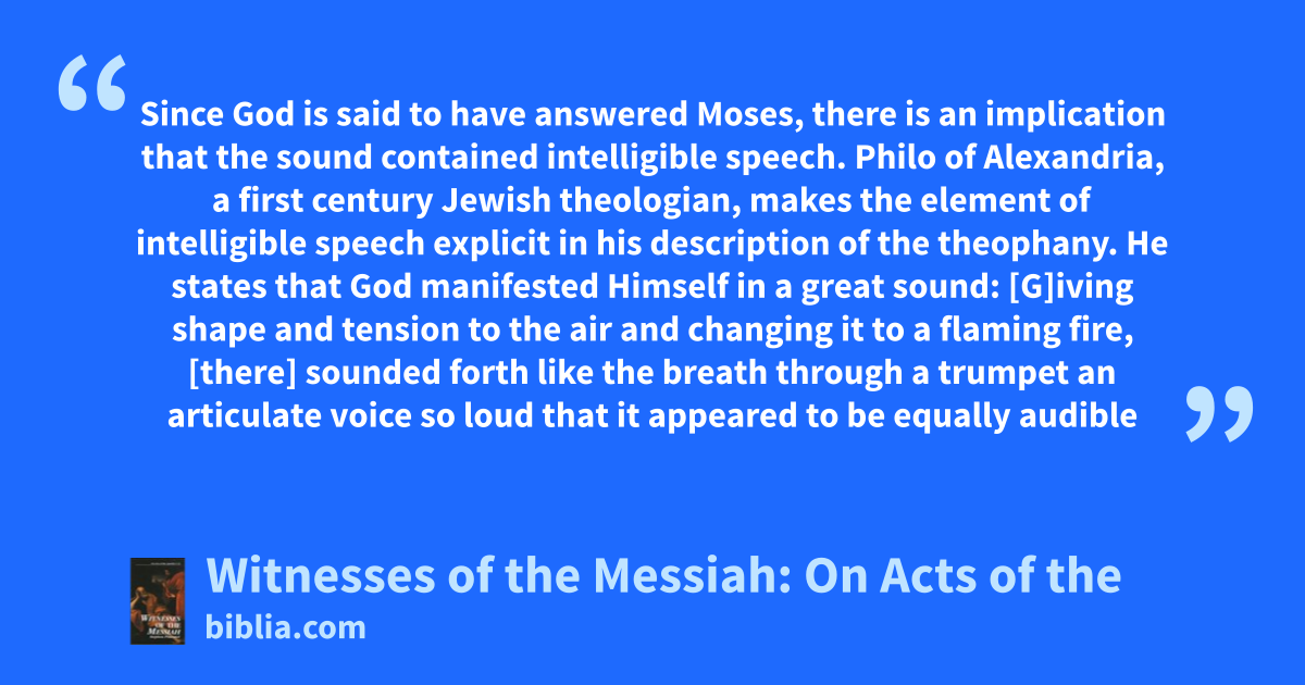 Since God is said to have answered Moses, there is an implication that the sound contained intelligible speech. Philo of Alexandria, a first century Jewish theologian, makes the element of intelligible speech explicit in his description of the theophany. He states that God manifested Himself in a great sound: [G]iving shape and tension to the air and changing it to a flaming fire, [there] sounded forth like the breath through a trumpet an articulate voice so loud that it appeared to be equally audible