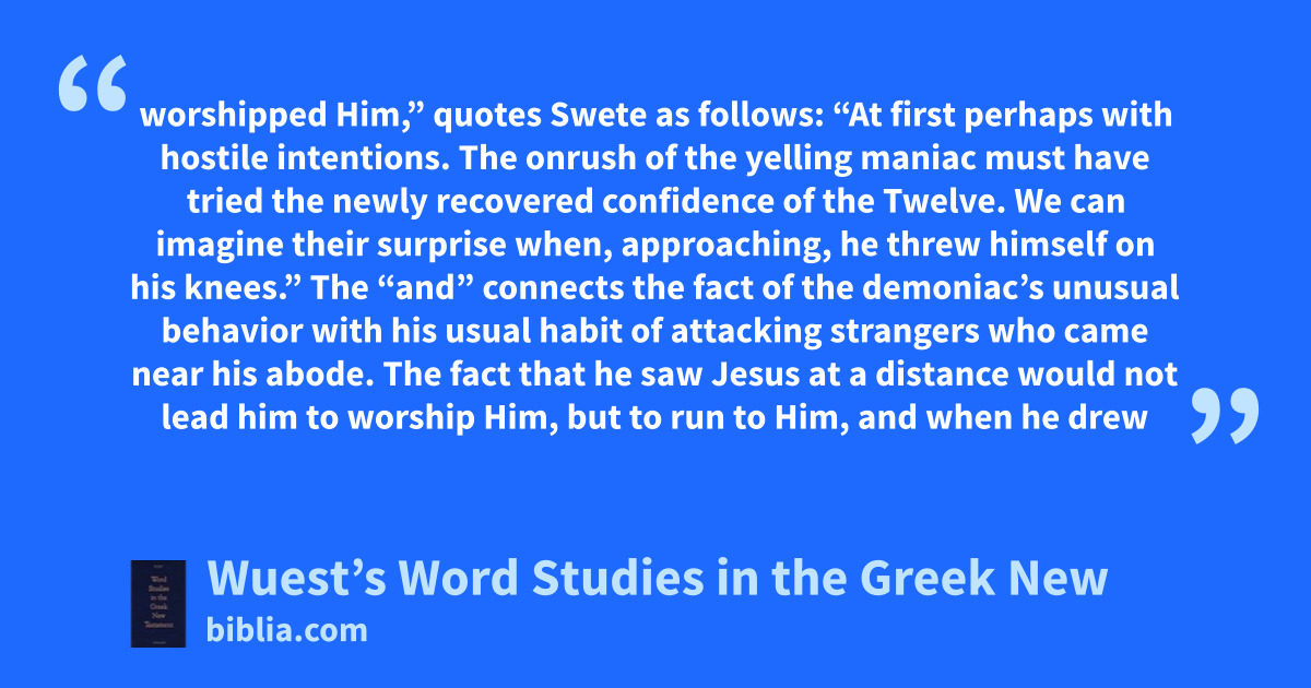 worshipped Him,” quotes Swete as follows: “At first perhaps with hostile intentions. The onrush of the yelling maniac must have tried the newly recovered confidence of the Twelve. We can imagine their surprise when, approaching, he threw himself on his knees.” The “and” connects the fact of the demoniac’s unusual behavior with his usual habit of attacking strangers who came near his abode. The fact that he saw Jesus at a distance would not lead him to worship Him, but to run to Him, and when he drew