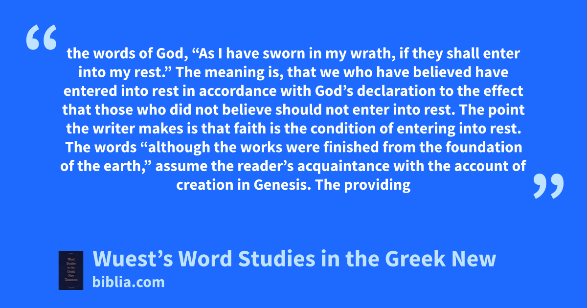 the words of God, “As I have sworn in my wrath, if they shall enter into my rest.” The meaning is, that we who have believed have entered into rest in accordance with God’s declaration to the effect that those who did not believe should not enter into rest. The point the writer makes is that faith is the condition of entering into rest. The words “although the works were finished from the foundation of the earth,” assume the reader’s acquaintance with the account of creation in Genesis. The providing