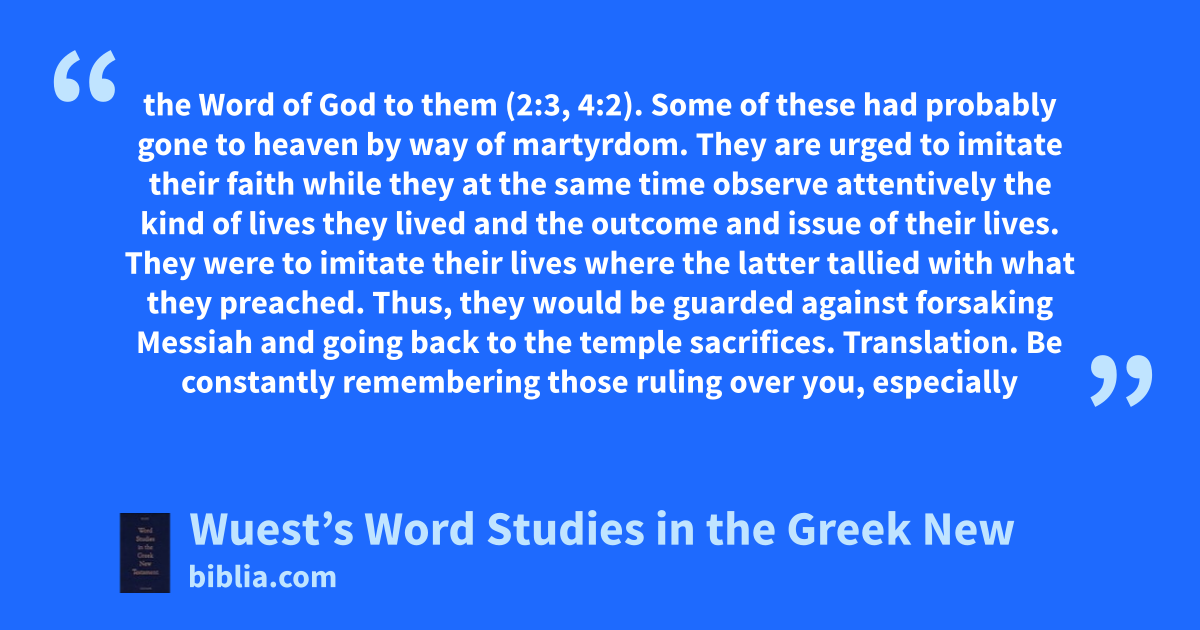 the Word of God to them (2:3, 4:2). Some of these had probably gone to heaven by way of martyrdom. They are urged to imitate their faith while they at the same time observe attentively the kind of lives they lived and the outcome and issue of their lives. They were to imitate their lives where the latter tallied with what they preached. Thus, they would be guarded against forsaking Messiah and going back to the temple sacrifices. Translation. Be constantly remembering those ruling over you, especially