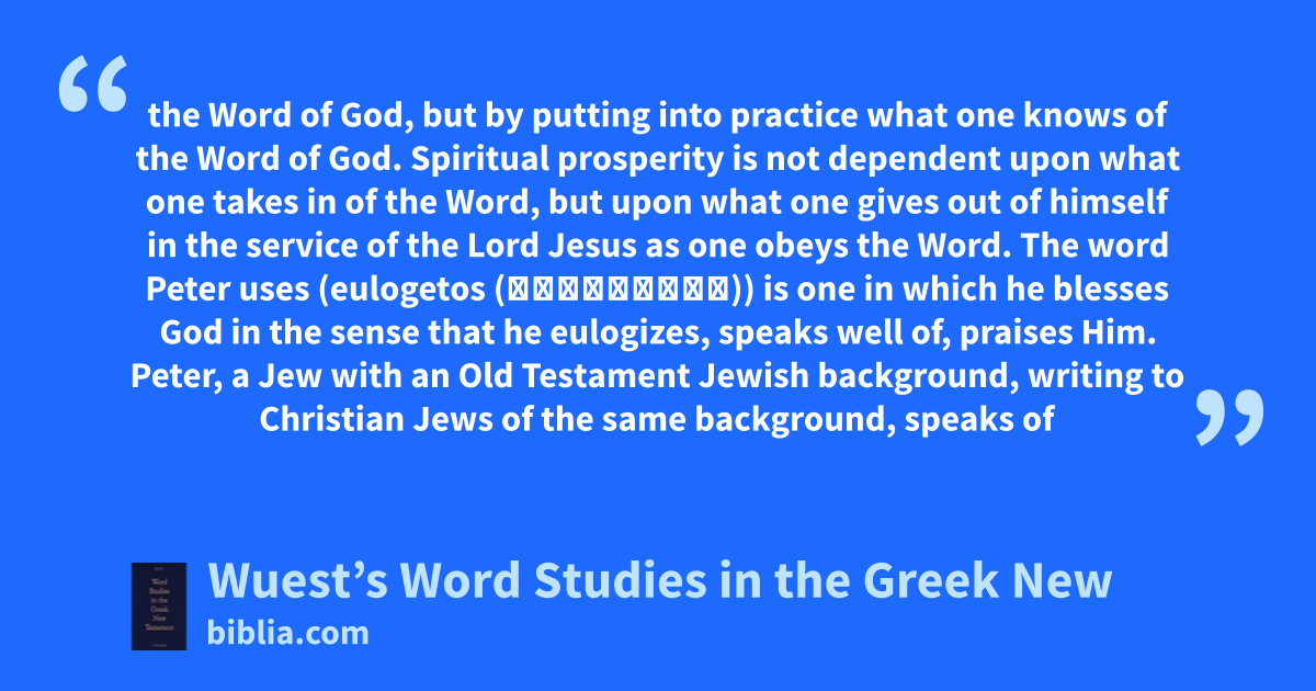 the Word of God, but by putting into practice what one knows of the Word of God. Spiritual prosperity is not dependent upon what one takes in of the Word, but upon what one gives out of himself in the service of the Lord Jesus as one obeys the Word. The word Peter uses (eulogetos (εὐλογετος)) is one in which he blesses God in the sense that he eulogizes, speaks well of, praises Him. Peter, a Jew with an Old Testament Jewish background, writing to Christian Jews of the same background, speaks of