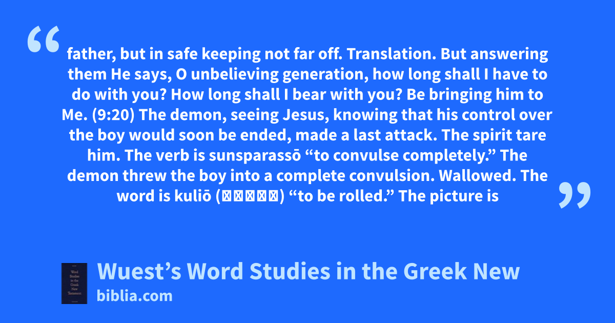 father, but in safe keeping not far off. Translation. But answering them He says, O unbelieving generation, how long shall I have to do with you? How long shall I bear with you? Be bringing him to Me. (9:20) The demon, seeing Jesus, knowing that his control over the boy would soon be ended, made a last attack. The spirit tare him. The verb is sunsparassō “to convulse completely.” The demon threw the boy into a complete convulsion. Wallowed. The word is kuliō (κυλιω) “to be rolled.” The picture is