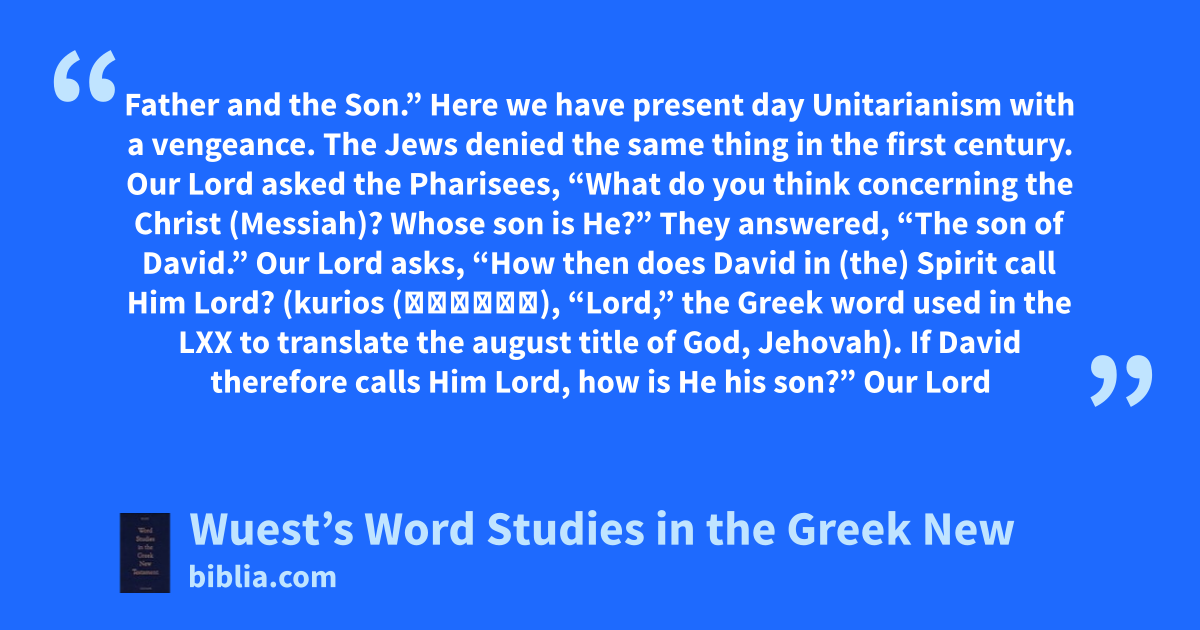 Father and the Son.” Here we have present day Unitarianism with a vengeance. The Jews denied the same thing in the first century. Our Lord asked the Pharisees, “What do you think concerning the Christ (Messiah)? Whose son is He?” They answered, “The son of David.” Our Lord asks, “How then does David in (the) Spirit call Him Lord? (kurios (κυριος), “Lord,” the Greek word used in the LXX to translate the august title of God, Jehovah). If David therefore calls Him Lord, how is He his son?” Our Lord