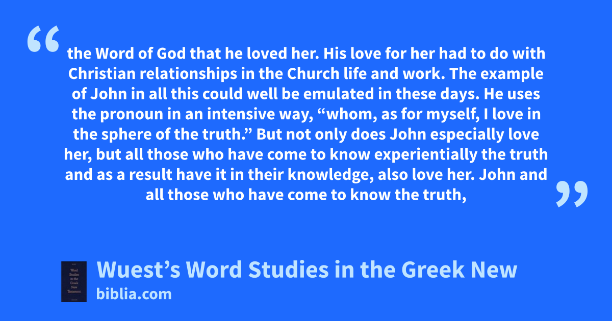 the Word of God that he loved her. His love for her had to do with Christian relationships in the Church life and work. The example of John in all this could well be emulated in these days. He uses the pronoun in an intensive way, “whom, as for myself, I love in the sphere of the truth.” But not only does John especially love her, but all those who have come to know experientially the truth and as a result have it in their knowledge, also love her. John and all those who have come to know the truth,