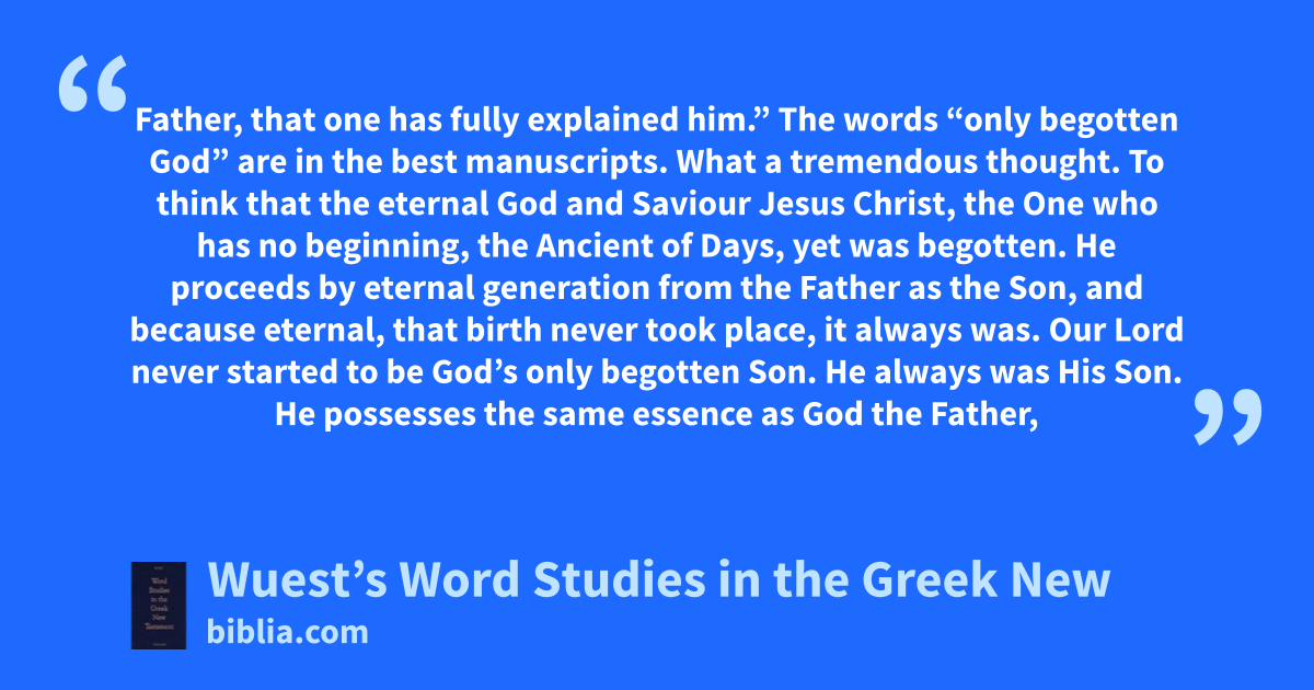 Father, that one has fully explained him.” The words “only begotten God” are in the best manuscripts. What a tremendous thought. To think that the eternal God and Saviour Jesus Christ, the One who has no beginning, the Ancient of Days, yet was begotten. He proceeds by eternal generation from the Father as the Son, and because eternal, that birth never took place, it always was. Our Lord never started to be God’s only begotten Son. He always was His Son. He possesses the same essence as God the Father,