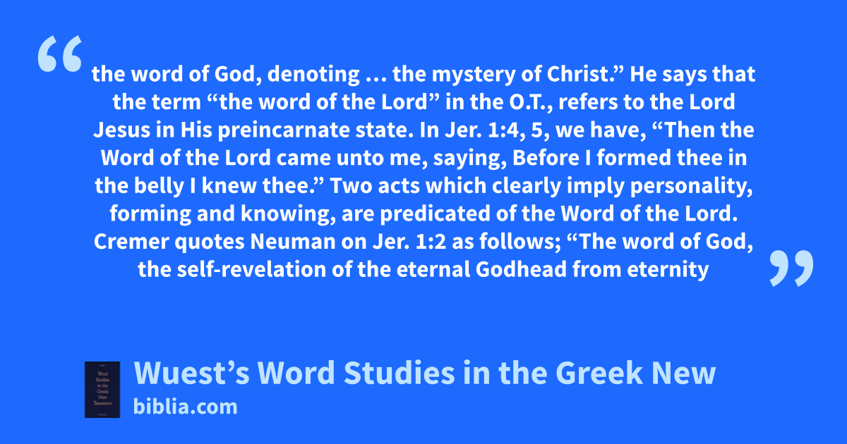 the word of God, denoting … the mystery of Christ.” He says that the term “the word of the Lord” in the O.T., refers to the Lord Jesus in His preincarnate state. In Jer. 1:4, 5, we have, “Then the Word of the Lord came unto me, saying, Before I formed thee in the belly I knew thee.” Two acts which clearly imply personality, forming and knowing, are predicated of the Word of the Lord. Cremer quotes Neuman on Jer. 1:2 as follows; “The word of God, the self-revelation of the eternal Godhead from eternity