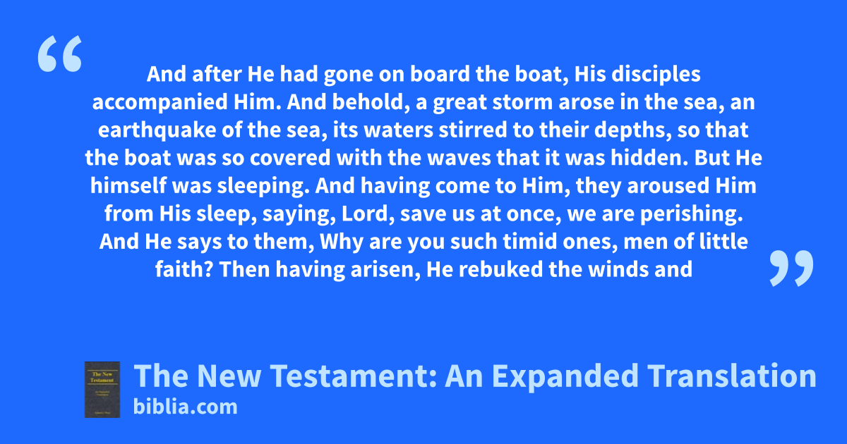 And after He had gone on board the boat, His disciples accompanied Him. And behold, a great storm arose in the sea, an earthquake of the sea, its waters stirred to their depths, so that the boat was so covered with the waves that it was hidden. But He himself was sleeping. And having come to Him, they aroused Him from His sleep, saying, Lord, save us at once, we are perishing. And He says to them, Why are you such timid ones, men of little faith? Then having arisen, He rebuked the winds and