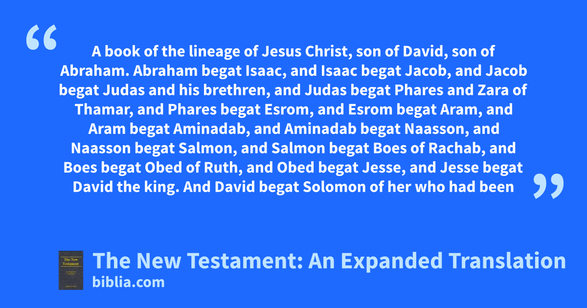 A book of the lineage of Jesus Christ, son of David, son of Abraham. Abraham begat Isaac, and Isaac begat Jacob, and Jacob begat Judas and his brethren, and Judas begat Phares and Zara of Thamar, and Phares begat Esrom, and Esrom begat Aram, and Aram begat Aminadab, and Aminadab begat Naasson, and Naasson begat Salmon, and Salmon begat Boes of Rachab, and Boes begat Obed of Ruth, and Obed begat Jesse, and Jesse begat David the king. And David begat Solomon of her who had been